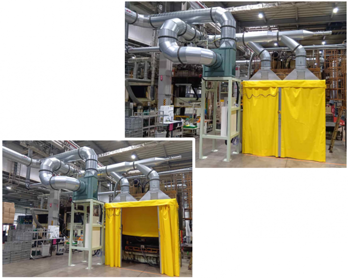 既に一部のプレス機には排気装置が設置されていましたが、既存の装置では